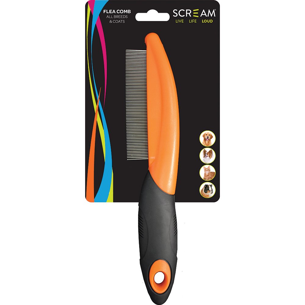 Scream flea comb. Plated iron pins glide through the coat to remove fleas, flea eggs and debris. The flea comb teeth are placed tightly together and will pick-up fleas in even the most dense coats. For all breeds and coats. 20cmL.