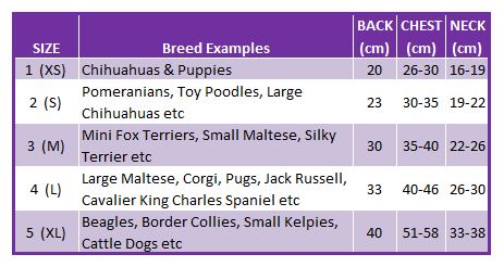Please note that the size chart (in photo 2) is a guide only For optimal fit measure your dog from the base of the neck (not from the collar) to the base of the tail.
