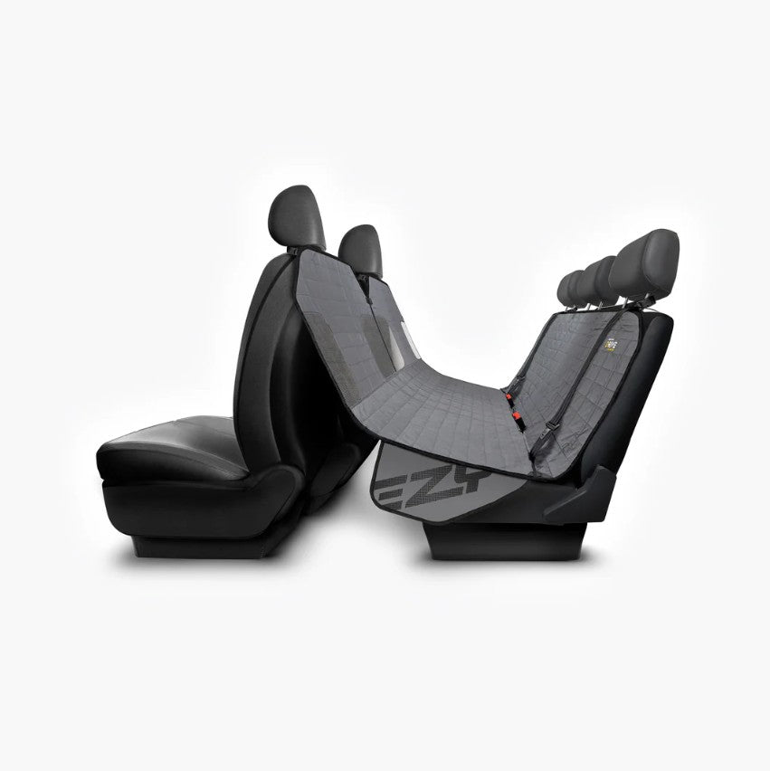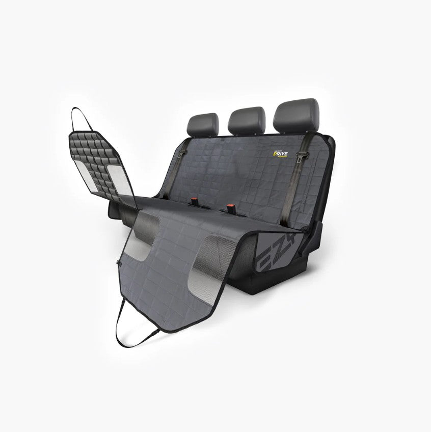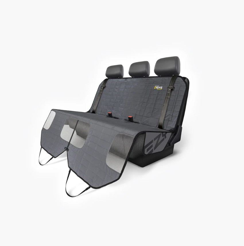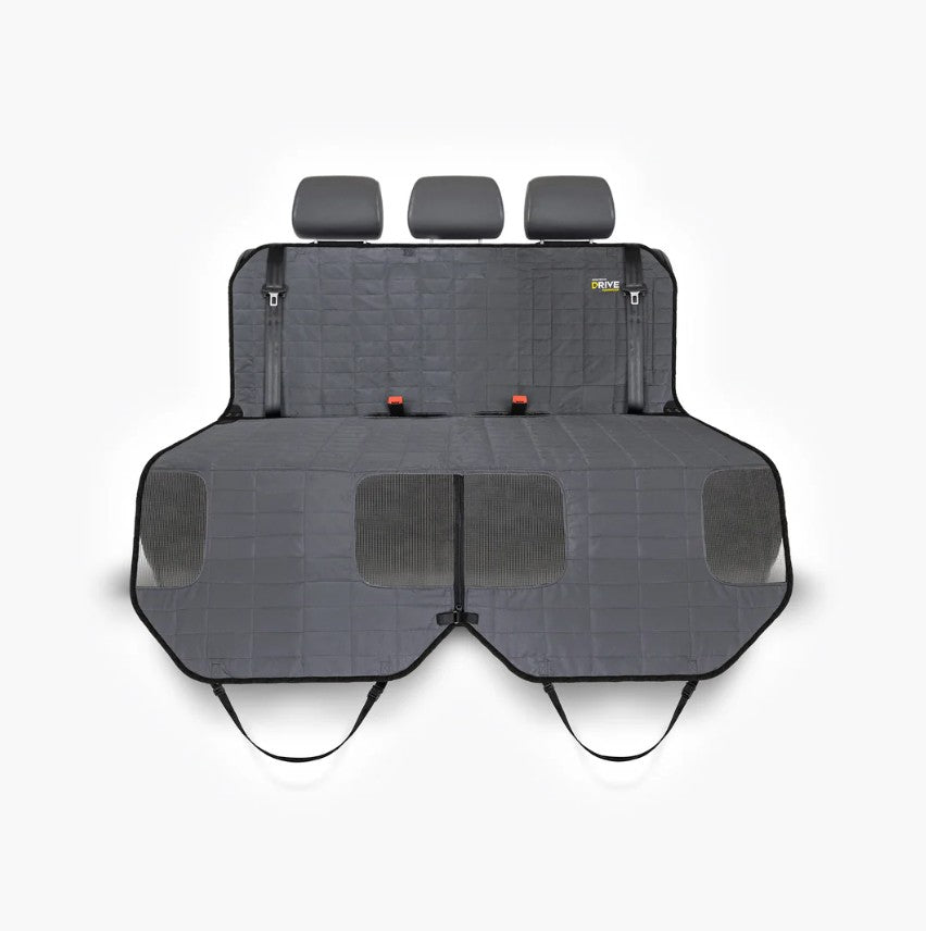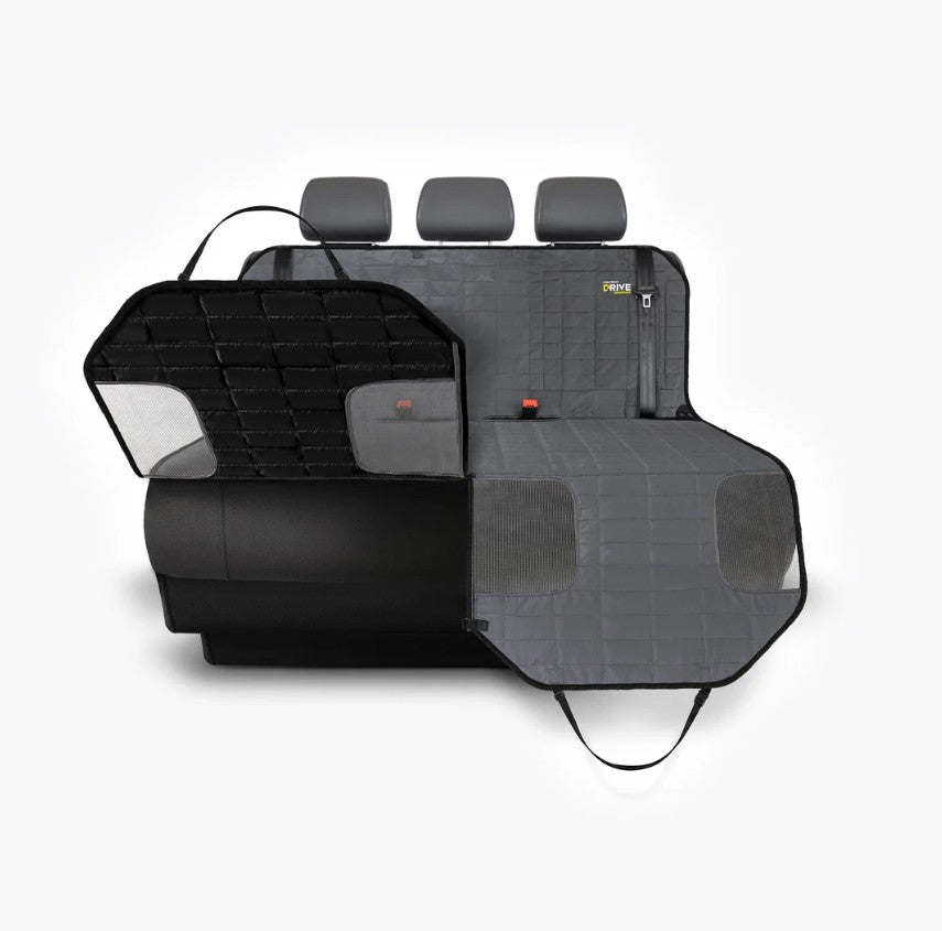 The Drive Hammock is a hammock-style seat cover for dogs to protect the backseats of your car. Easy to fit using your existing car headrests, the water-resistant polyester cover provides a barrier between pet and driver for additional safety on the road. With its flexible design, air mesh vents and quilted finish, your dog will be kept at ease during all types of transit. The non-slip base adds stability to the cover, keeping your pets relaxed and your car seat fully protected for the DRIVE™
